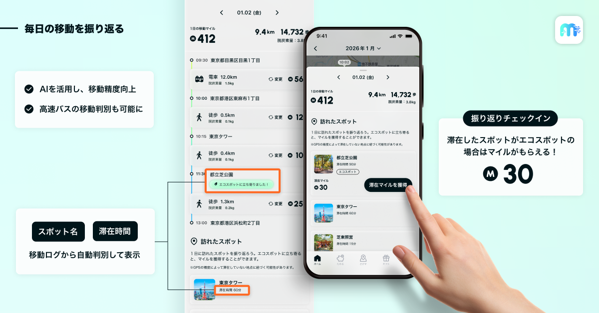 これまでの移動ログでは住所のみを表示していましたが、今回、具体的なスポット名が表示されることで、ユーザーは1日の行動をより鮮明に振り返ることができます。さらに、チェックインによりマイルも獲得でき、エコな商品やサービスへの交換などに利用可能です。なお、「振り返りチェックイン」機能を利用すると、通常より3倍のマイルがたまります※。