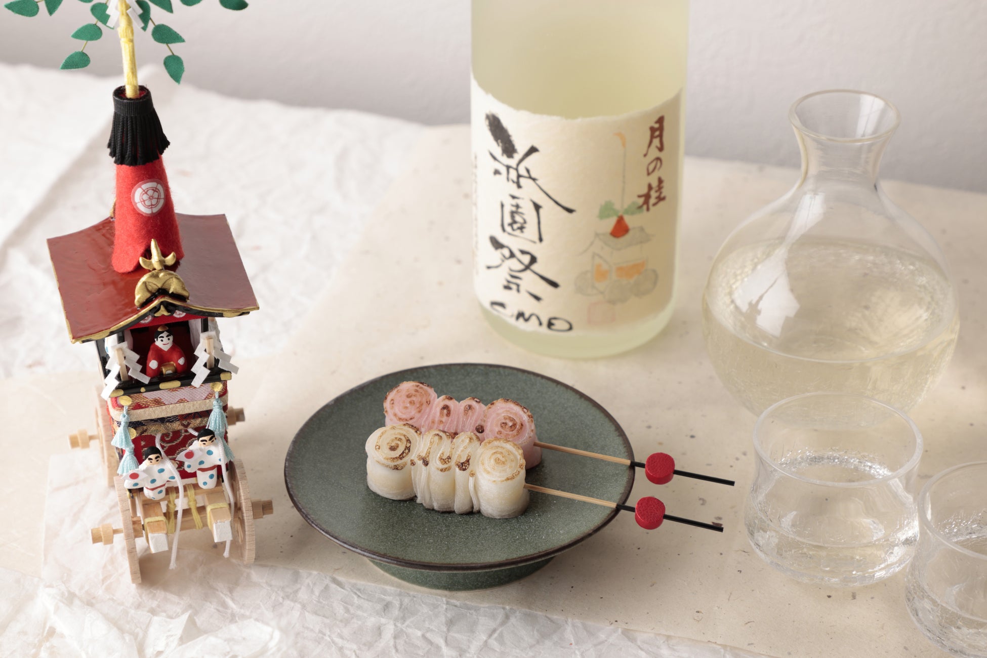 祇園祭の宵山では、屋台を巡り、提灯に灯された山鉾をゆっくりと鑑賞するのが醍醐味です。OMOベースで宵山気分を味わえるように、日本酒とアテの「宵酒(よいざけ)セット」を用意します。日本酒を選定したのは、祇園祭を見守り続けてきた錦市場で200年以上酒屋を営む「津之喜酒舗(つのきしゅほ)」です。津之喜酒舗限定で増田徳兵衛商店が醸造した「月の桂 祝い純米吟醸」に、店主が手書きでOMO限定ラベルを仕上げました。アテとして、京都の人々が祭期間中に食べる和菓子「稚児餅(*6)」をOMOオリジナルで用意します。柔らかい求肥に白味噌をのせて炙った稚児餅の程よい甘さと塩味が、日本酒と相性抜群です。「宵酒セット」を楽しみながら館内の展示で山鉾を知り、宵山の当日には、お出かけの前のアペロとしても楽しめます。