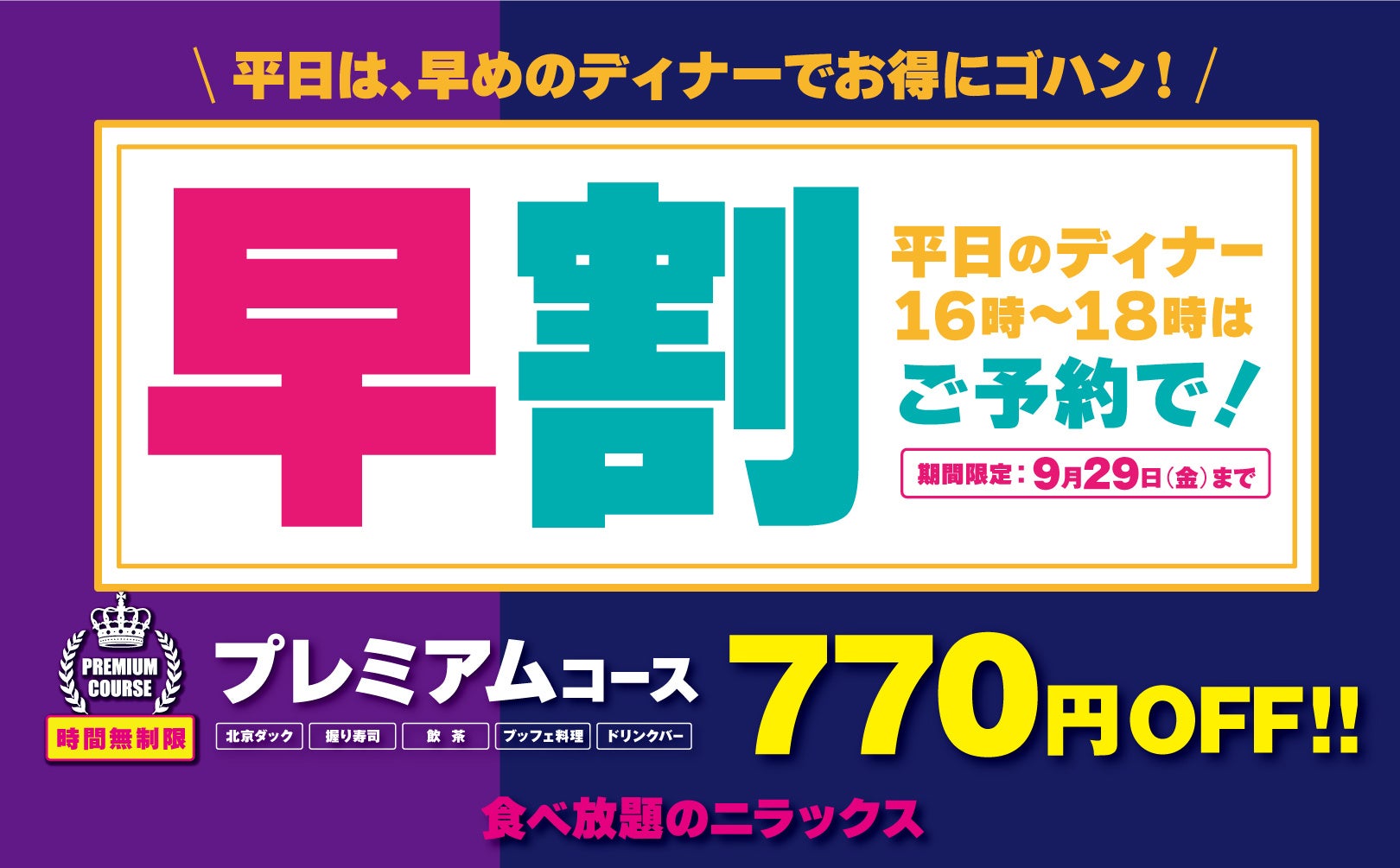 【770円もお得‼時間無制限‼充実の食べ放題‼】『ニラックスブッフェ』2店舗の“平日16時‐18時”のご予約限定!プレミアムコースが770円引きでお得に満喫できる『早割』のご予約を開始いたします!