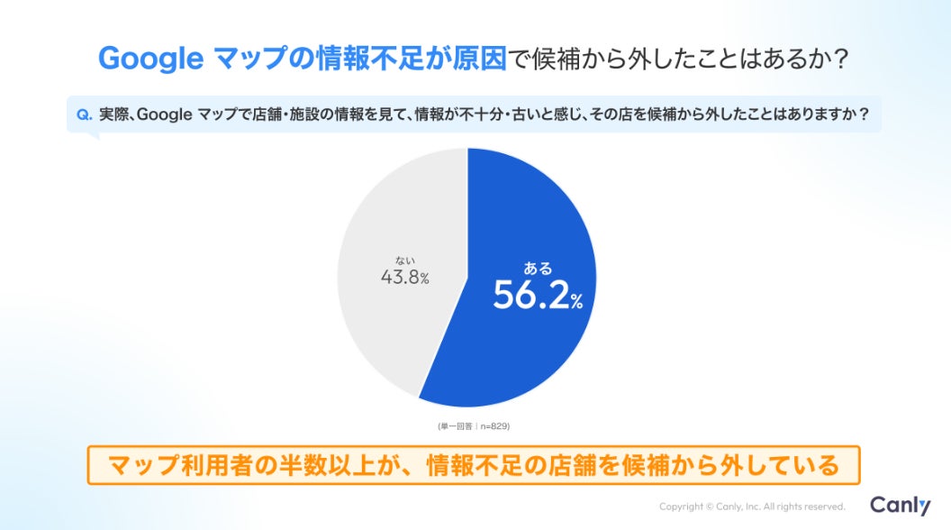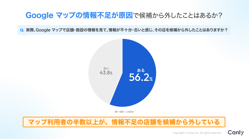 さらに、せっかくお店に興味を持ってもらえても、マップ上の店舗情報が手つかずのままだと、半数以上の方がお店に行く前に候補から外してしまう可能性も見えてきました。