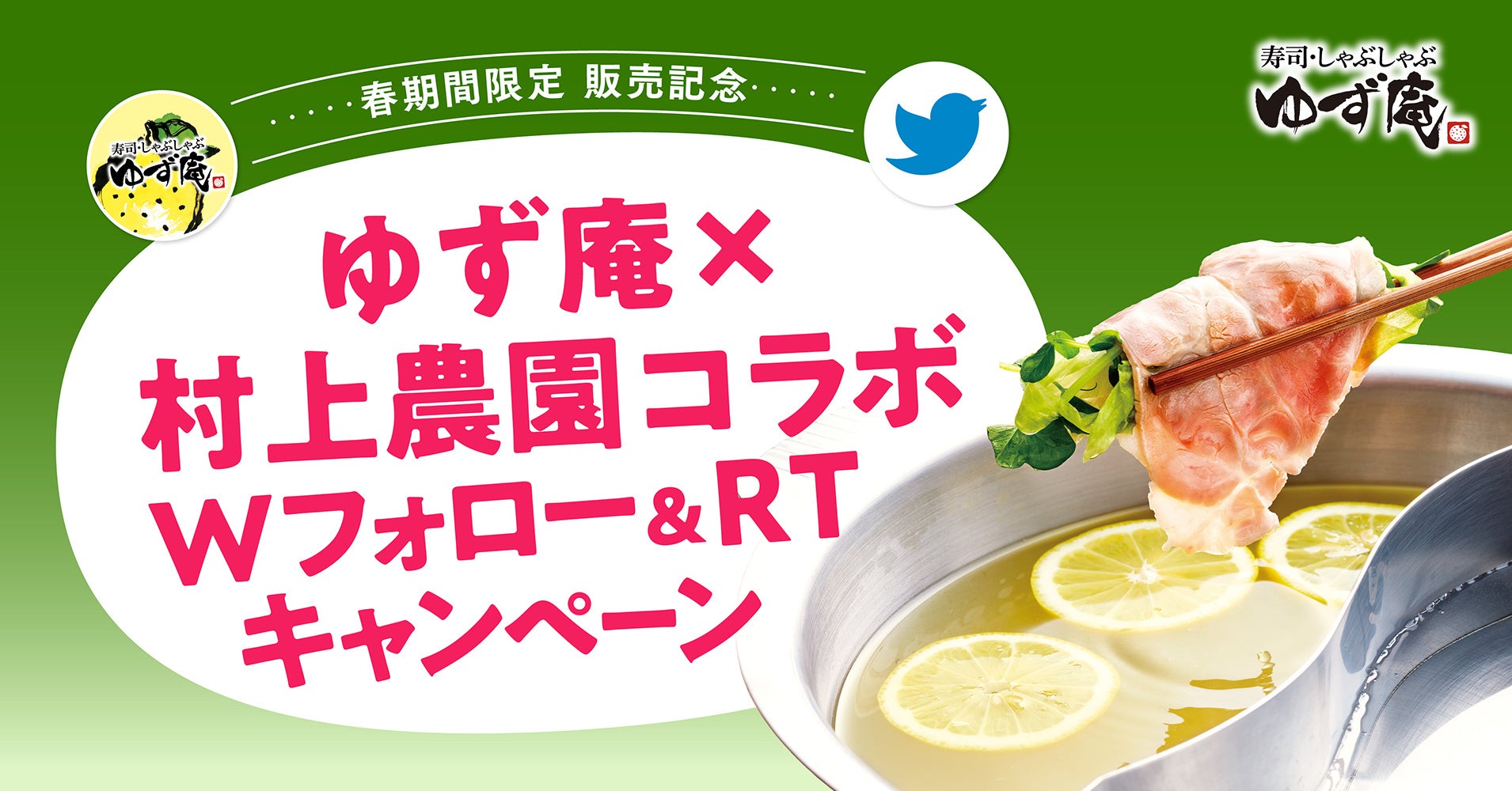株式会社物語コーポレーション(本社:愛知県豊橋市/代表取締役社長:加藤 央之)が全国94店舗展開する『寿司・しゃぶしゃぶ ゆず庵』(以下、ゆず庵)は、春期間限定メニューの販売を記念して、スプラウトの国内最大手企業、株式会社村上農園(本社:広島県広島市/代表取締役社長:村上 清貴)とのWフォロー&リツイートキャンペーンを開催いたします。