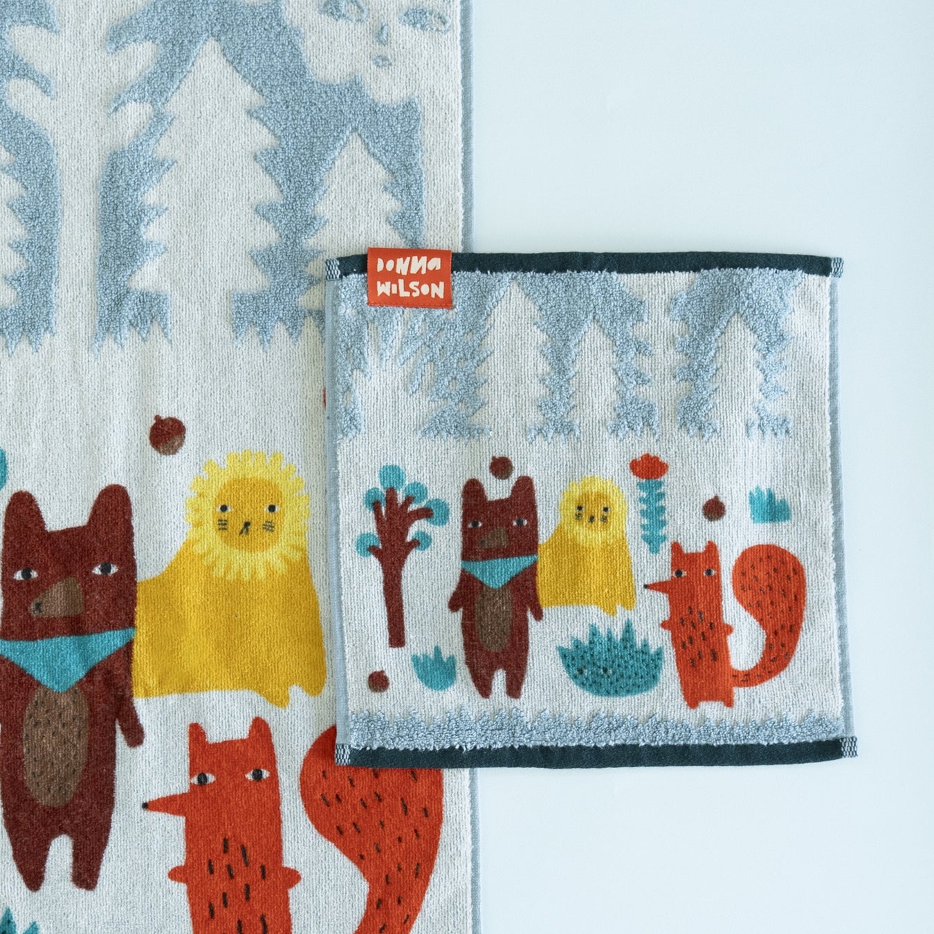 ドナ・ウィルソンの代表的なクリーチャー「キツネリスのシリル」「ライオンのリッチー」「くまのテッド」と草や木々が森の中に大集合しているタオルです。