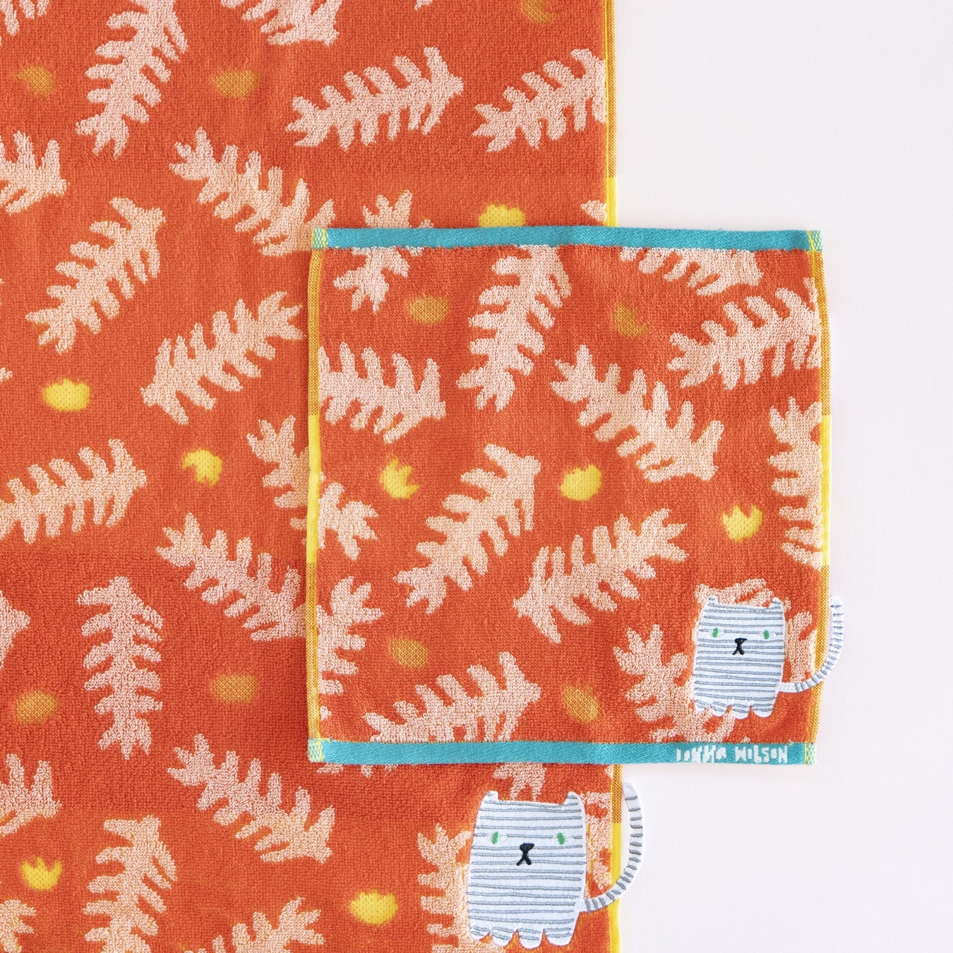 葉っぱのモチーフに、キツネリスのシリルのアップリケがついたタオル。はみ出したしっぽのデザインがポイント。