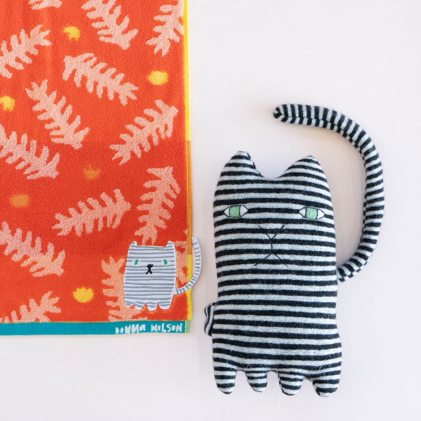 ドナ・ウィルソンのクリーチャー「モノクロのねこ」のしっぽがはみ出したアップリケがついたタオル。