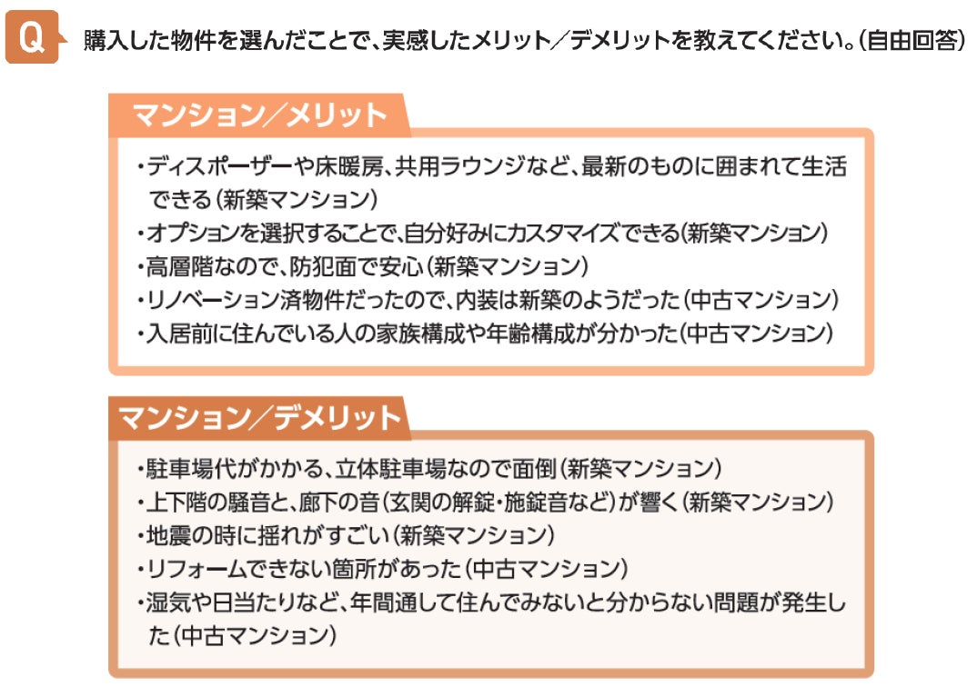 マンション購入者に実感したメリット・デメリットを聞いたところ、防犯面や最新の設備にメリットを感じる人が多い一方、上下階の音などが気になるという意見が多く見られました。購入の際は、部屋の様子だけではなく、防音性などもしっかりと確認すると良さそうです。