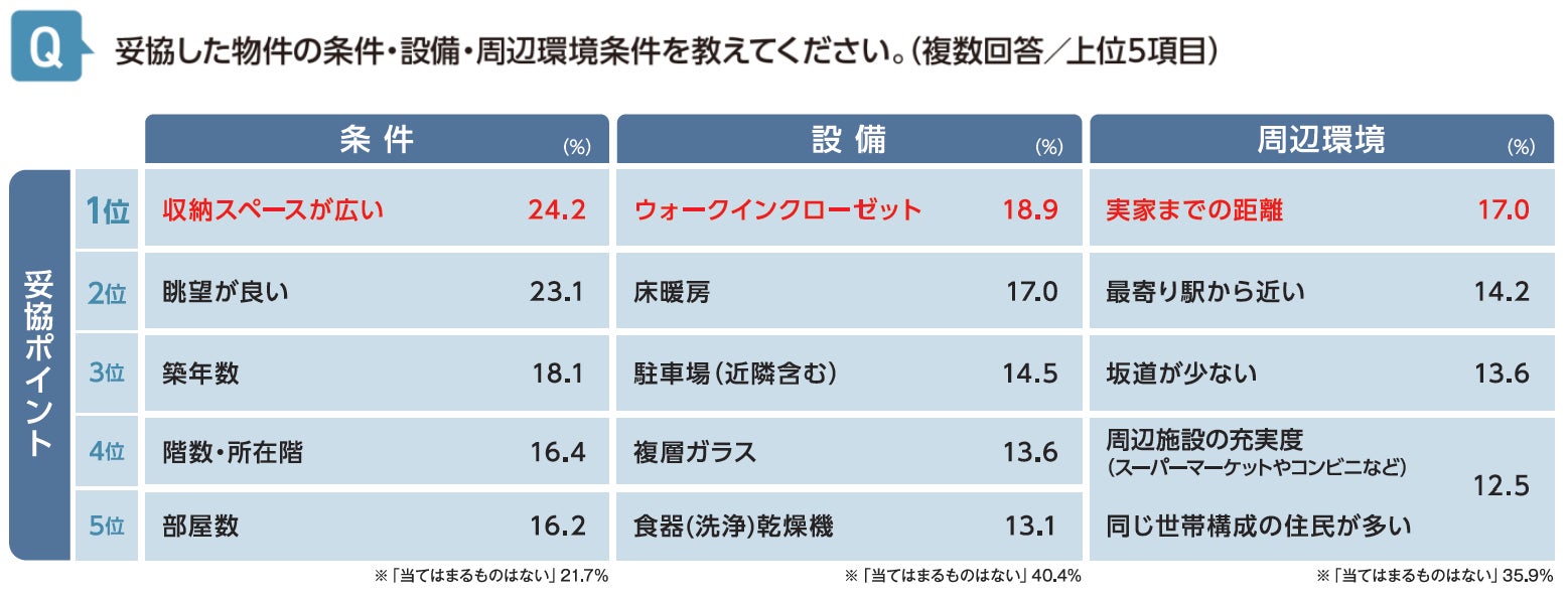 ■妥協したポイント 条件1位「収納スペースが広い」、設備1位「ウォークインクローゼット」、周辺環境1位「実家までの距離」