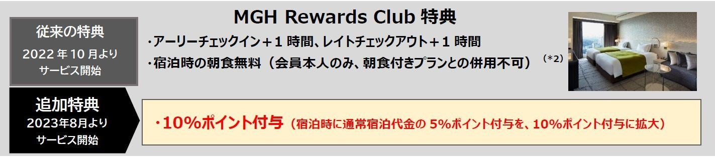 (*2)対象ホテルはザ セレスティンホテルズ・三井ガーデンホテルズ・sequenceとなり、MGH Rewards Clubの会員登録、および公式ホームページからの宿泊予約が必要です。また、アーリーチェックイン、レイトチェックアウトは当日の状況により承ることができない場合がございます。(sequenceはレイトチェックアウト+1時間の