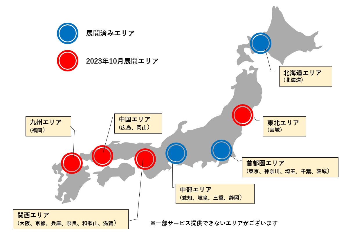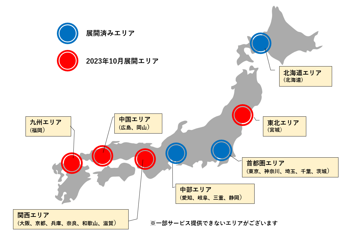 また、これまでは首都圏のみでサービス提供しておりましたが、主要6拠点(北海道・東北・中部・関西・中国・九州)にもサービス提供エリアを拡大いたします。