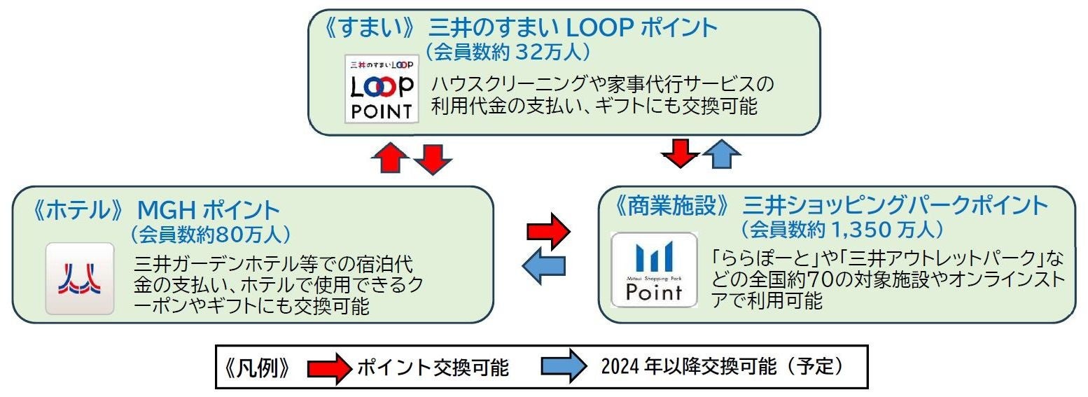 2023年8月より、三井不動産グループのすまい会員組織「三井のすまいLOOP」、および商業施設会員組織「三井ショッピングパークメンバーズプログラム」、ホテル会員組織「MGH Rewards Club」が連携しポイント交換が可能となり、他の会員組織のサービスを利用することができます。三井不動産グループ内の商品・サービスのクロスユースを促進します。