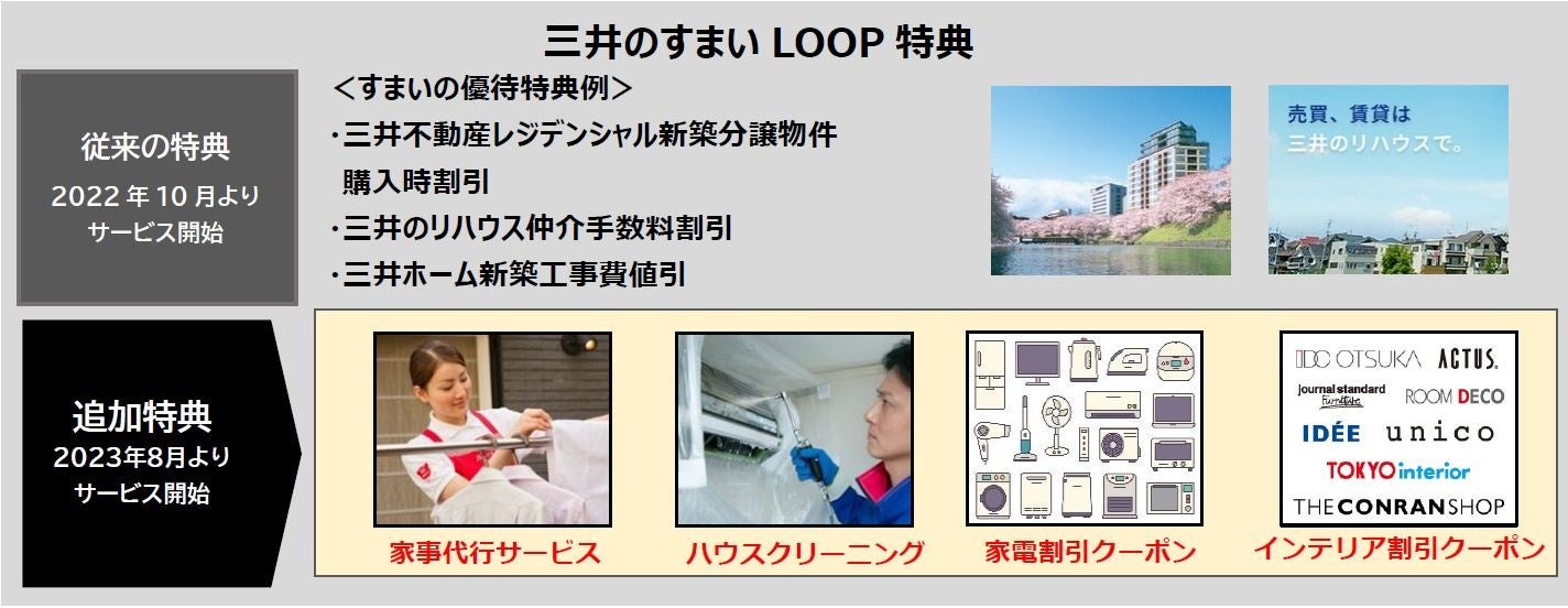 三井不動産株式会社(本社:東京都中央区、代表取締役社長:植田俊)および三井不動産住宅グループ22社(*1)は、三井不動産グループのすまい関係の取引(新築・仲介・賃貸・リフォーム・インテリアなど)をいただいたお客様を対象とした、すまいとくらしに関する様々なサービスを提供する会員組織「三井のすまいLOOP」(会員数約32万人:2023年9月時点)において、2022年にサービス開始10周年を迎えたことを契機として、同年10月よりサービスコンテンツの拡充やプレミアム会員制度の創設など、大幅リニューアルを実施してきました。