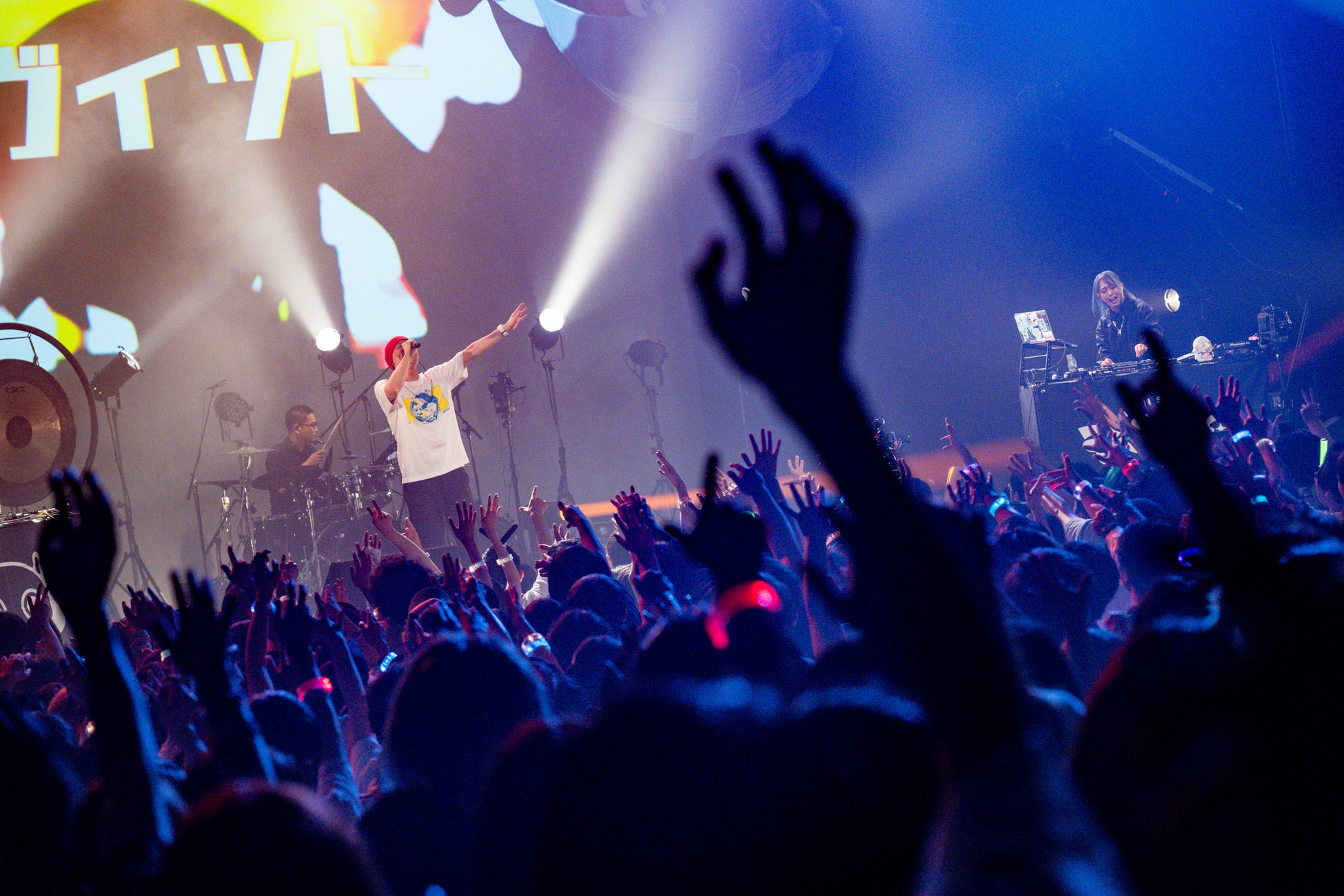 そしてピノキオピーが「みなさん、宴もたけなわですが、乾杯!」と音頭をとって始めたのは東京公演限定曲の『頓珍漢の宴』。早口言葉のような歌詞がクセになるサビ部分を初音ミクとピノキオピーが声を重ねて歌唱していく。同曲のお約束パート、ラストオーダーはscratch&samplerとして参加しているRKの「お冷三つで!」コールに観客も沸く。