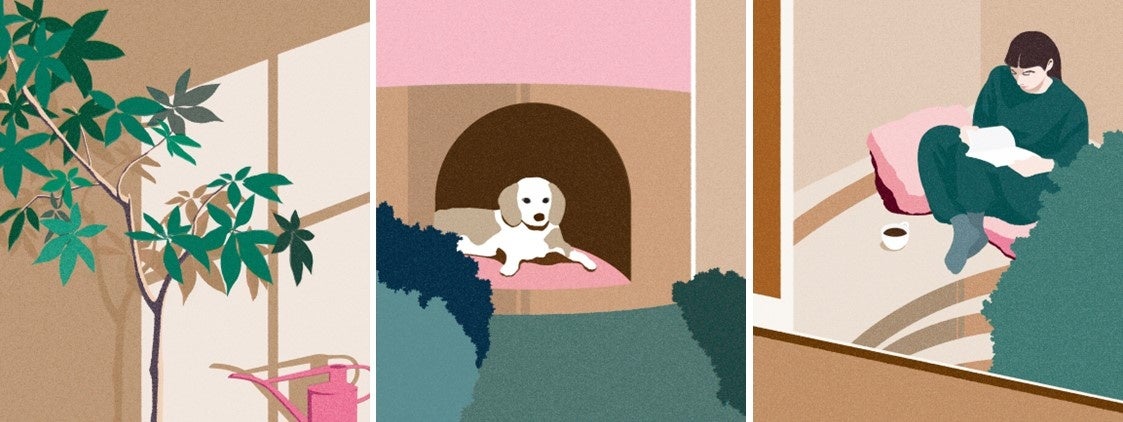 bloomoiが展示する部屋のタイトルは「私の輪郭に出会う」です。多くの方と対話し「私らしい暮らし・住まい」とは何かを考える活動の結果、本展ではその象徴として「庭のある生活」「ペット」「ヌック」の三つの軸を表現しました。庭を思わせる緑とペットをそばに置きながら、一人に戻れるこの空間は私らしさを見つけられる隠れ家です。深く呼吸し、ぼやけていた「私の輪郭」をなぞる時間をぜひご体験ください。