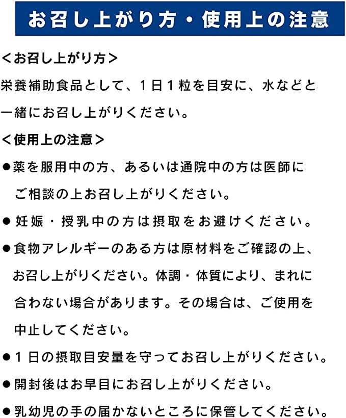 栄養補助食品として、1日1粒を目安に、水などと一緒にお召し上がりください。