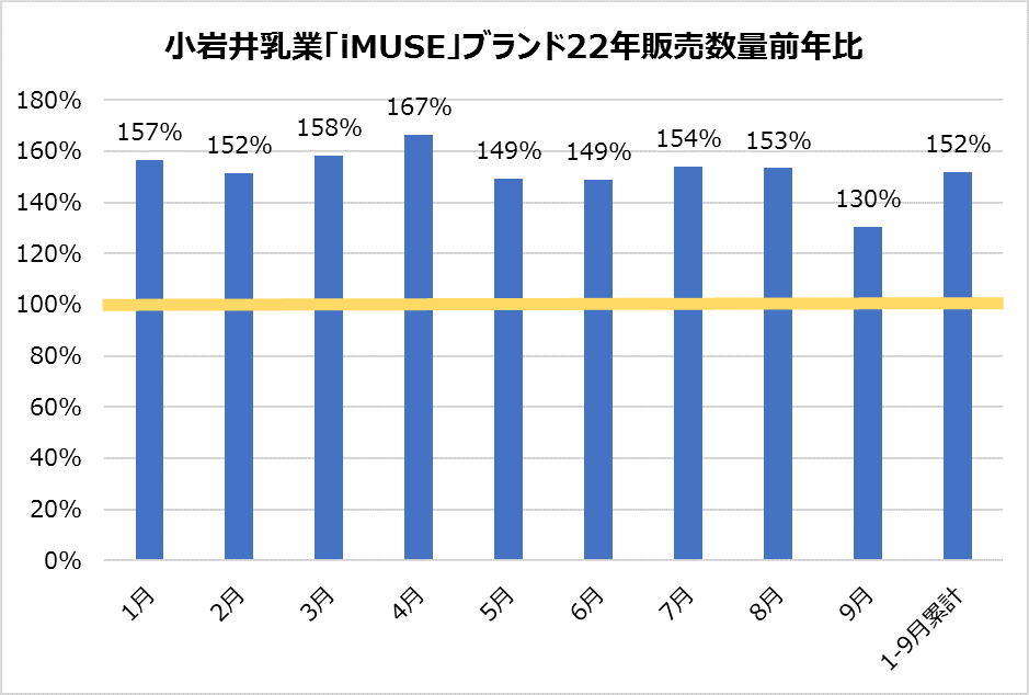 ・「小岩井 iMUSE(イミューズ)生乳(なまにゅう)ヨーグルト甘さ控えめ400g」はお客様のリピート率も高い水準で安定し、2022年1~9月累月の販売数量は前年比8割以上の伸長を記録し、好調に推移。