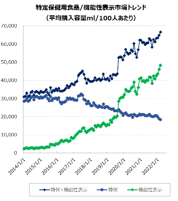 飲料カテゴリーにおいて、特定保健用食品の推移は2017年から下降傾向にある一方、機能性表示食品は2015年以降、継続的に伸長※3。これは、機能性表示食品が、特定保健用食品に比べて幅広いカテゴリーで開発・発売されており、お客様の健康課題に適合していることが一因と考えられる。昨今、お客様の健康志向の高まりに対応し、数多くの商品ラインアップが販売されていることから、飲料カテゴリーにおける機能性表示食品市場は、2022年以降も継続的な拡大が見込まれる。