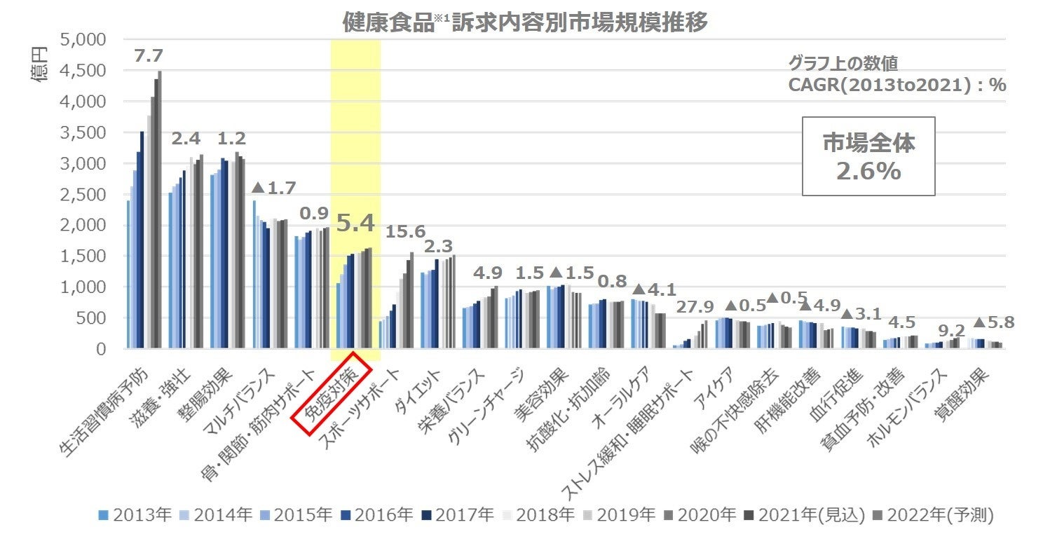 健康食品(サプリメント・食品・飲料)に関する調査※1では、2013年~2021年における健康食品市場全体の年平均成長率が2.6%であることに対し、「免疫対策」市場の年平均成長率は5.4%と高水準を維持しており、2022年以降も継続的な成長が期待されている。