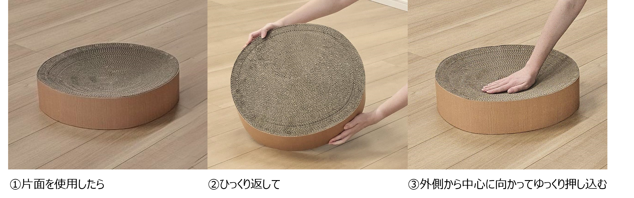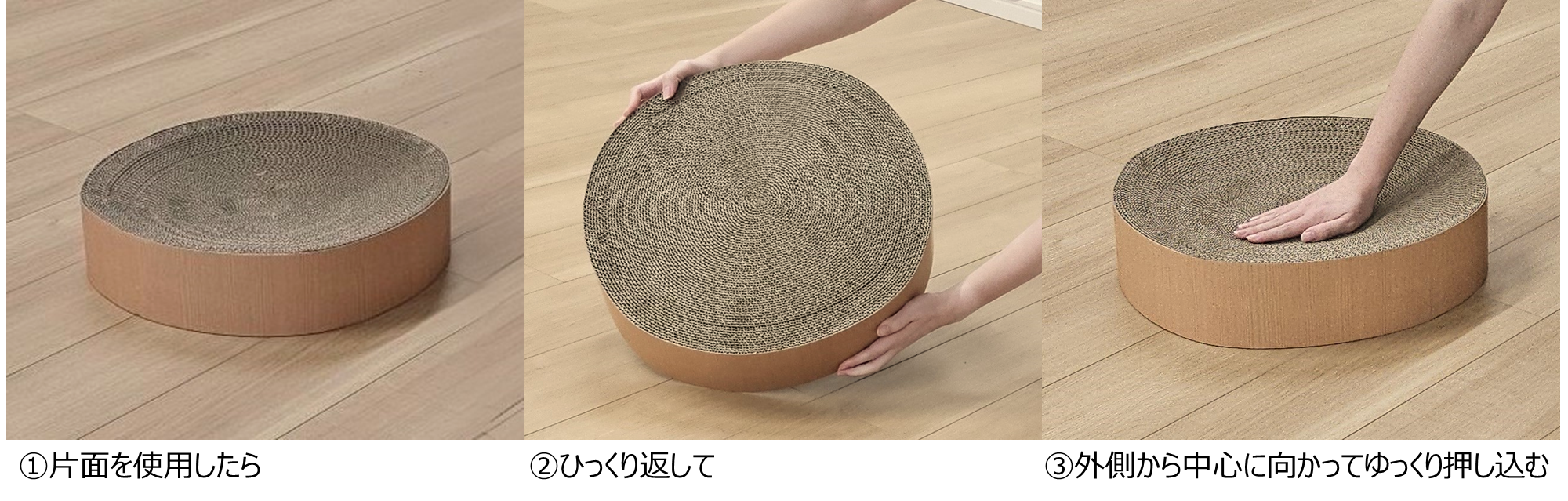 本製品は、両面が使える爪とぎです。➀片面を使用したら、②ひっくり返し、③平らな上面をすり鉢型になるよう外側から中心に向かってゆっくり押し込むことで、反対の面をお使いいただけます。1つで一般的な爪とぎ2個分の役割を果たすため、買い替えの頻度が半減し、お財布に優しい商品です。また、インテリアになじむ木目調のデザインで、置き場所にも困りません。さらに、すり鉢型の“くぼみ”が猫ちゃんにとって心地よく、遊び終わった後には、丸くなって眠る愛らしい姿を観察していただけます。