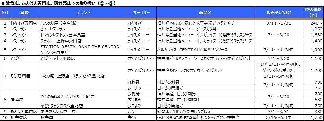 ~いよいよ3月16日北陸新幹線延伸!~福井県産食材使用メニューや福井県のソウルフードなど“北陸新幹線 敦賀延伸記念”商品を首都圏エキナカ店舗で3月1日(金)から順次販売いたします。