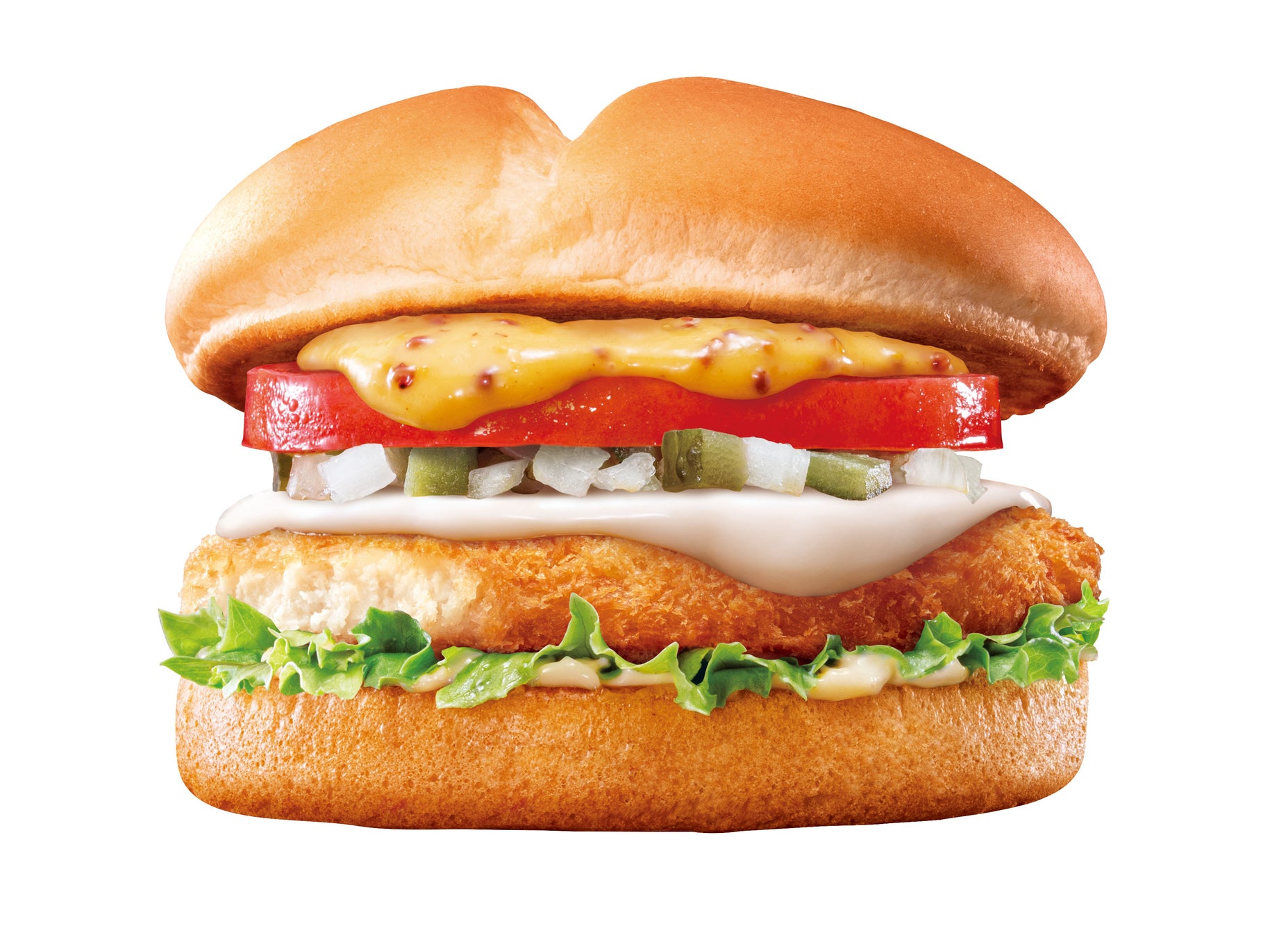 商品概要:鶏むね肉をサクサクの衣で仕上げたチキンパティに、スライストマト、とろ~りチーズソース、ダイスカットした玉ねぎとピクルス、ピリッとした辛みと甘みが特長の特製ハニーマスタードソースを合わせ、ふっくらなめらかな食感のバンズで挟んだ「トマト&チーズのチキンカツバーガー」のお得なランチセットです。