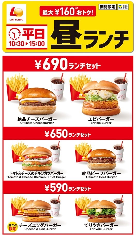 ロッテリアは、単品ごとのご注文よりお得な「MMセット※1」を、平日10:30~15:00限定でさらにお得に楽しめる「平日昼ランチ」として展開し、大変ご好評をいただいています。