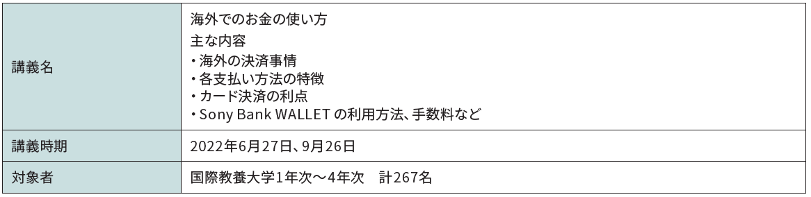 ソニー銀行株式会社(代表取締役社長:南 啓二/本社:東京都千代田区/以下 ソニー銀行)は、安心・安全に海外で学ぶ学生の皆さまを応援するため、国際教養大学(学長:モンテ・カセム/秋田県秋田市)において「海外留学時のお金の使い方」の授業を実施しましたので、お知らせいたします。