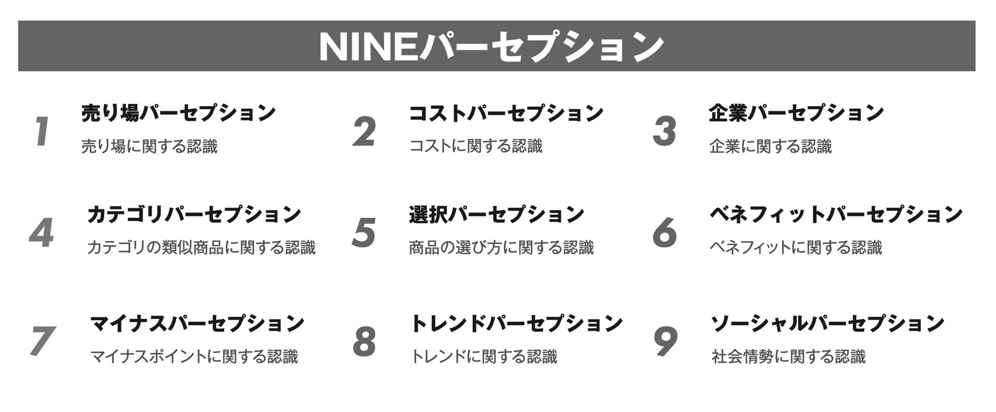SNSから消費者のパーセプションを抽出するために独自開発したフレームワーク「NINEパーセプション」を本書で初公開します。9つの視点でパーセプションを抽出することで、抜け漏れを防ぐだけでなく、ターゲットの解像度が高まったり、新ターゲットの発見にもつながる効果があります。