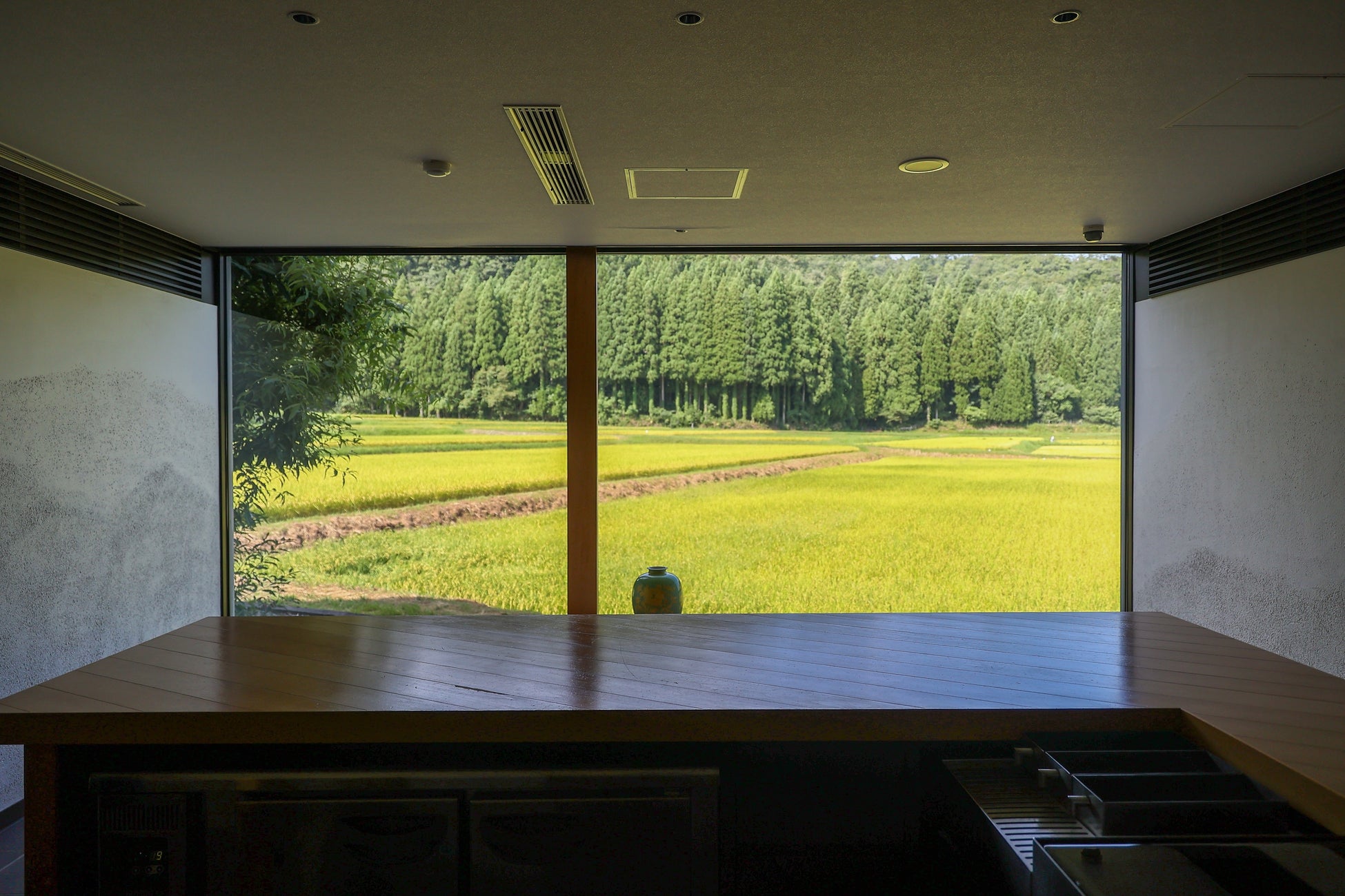 農口尚彦研究所の一角にあるのが、テイスティングルーム「杜庵(とうあん)」。茶室をイメージして造られた部屋は一面がガラス張り。四季折々の景色を眺めながら、日本酒と、ペアリングしたおつまみを楽しめます。
