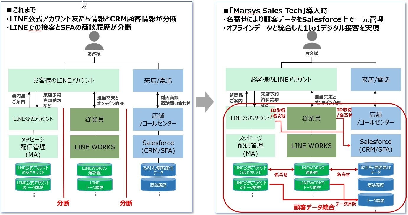 「Marsys Sales Tech」を導入することによって、企業側ではマーケティング上の顧客データやLINE公式アカウント・LINE WORKSでのコミュニケーション情報をSalesforceに集約でき、一元管理することが可能になります。また、顧客側はLINE公式アカウントにおけるサービスや営業担当者とのコミュニケーション、購買、アフターサービスまでの一連の体験をLINE上で一貫して行えるようになります。