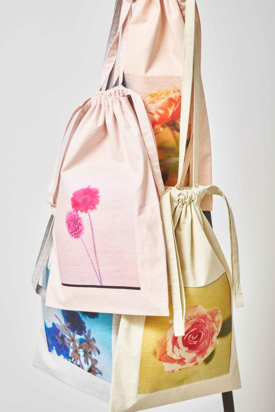 繊細な生地で制作したブックバッグは、巾着ポーチ(ポシェット)、ショルダー、ミニマムトートの3WAY仕様で、デイリーに活躍するサイズ感とシンプルなデザインが特徴。フロントに施した写真プリントが生地の色に影響・共鳴して、このバッグだけの新たな写真作品が誕生しました。ボディカラーはボタニカルダイの柔らかい印象で、アプリコット・グリーンティー・さくら・ブルーベリーの4色を展開します。