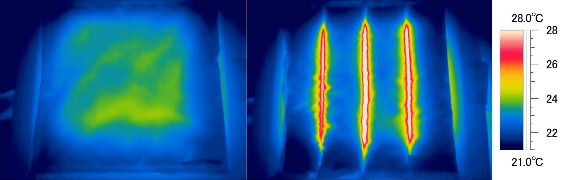 ※3 20℃65%RH環境下において、40℃の熱板上に同目付の試料を設置。3分後にサーモカメラで試料表面を計測。試料:『テックフィルブレスサーモ』、ダウン(650FP ダウン90%)