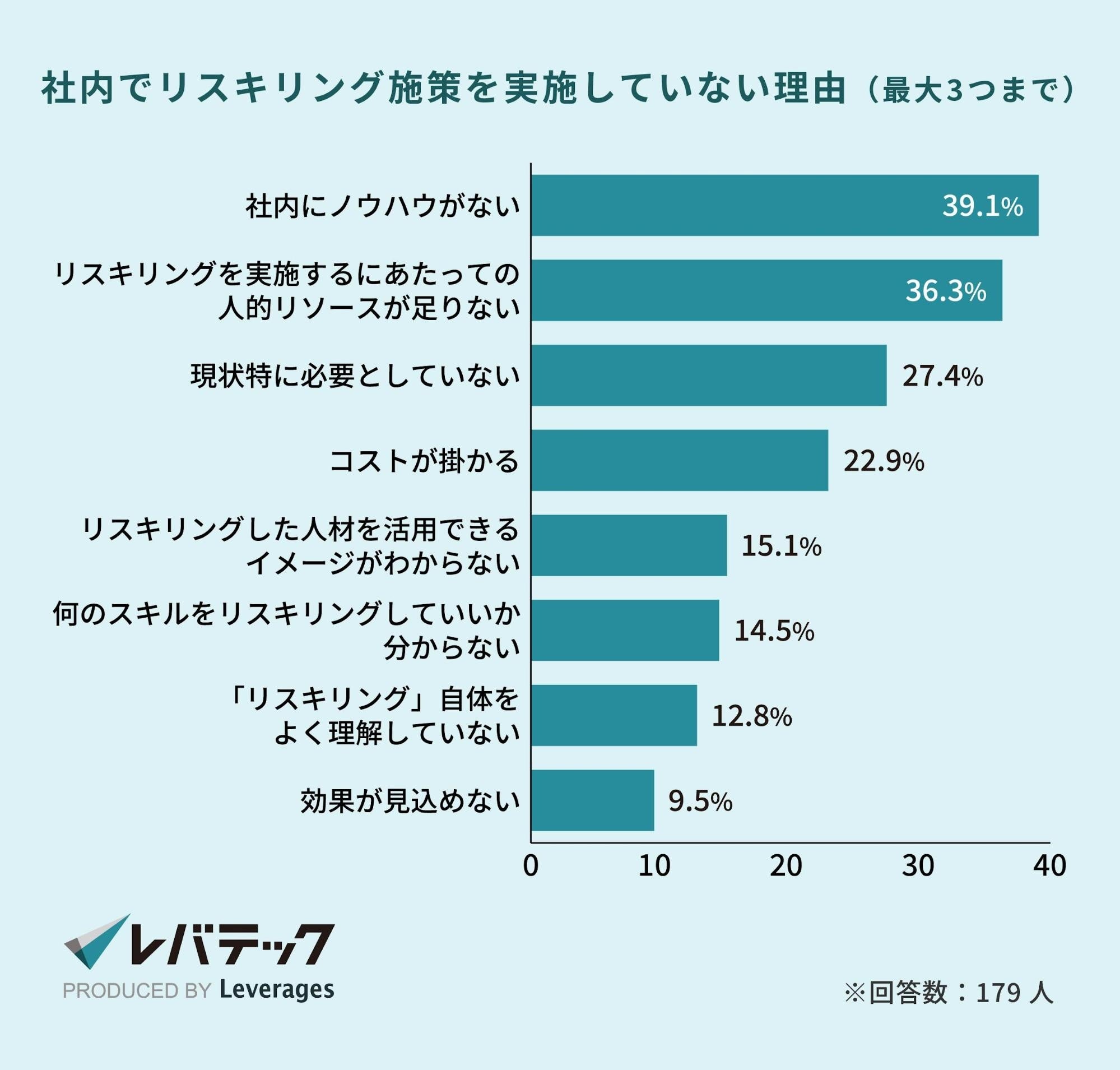 リスキリング施策を「実施しておらず、する予定も無い」と答えた理由として最も多かったのは「現状特に必要としていない(40.7%)」となりました。「実施していないが検討中」と答えた理由には、「リスキリングを実施するにあたっての人的リソースが足りない(52.1%)」「社内にノウハウがない(52.1%)」があげられています。