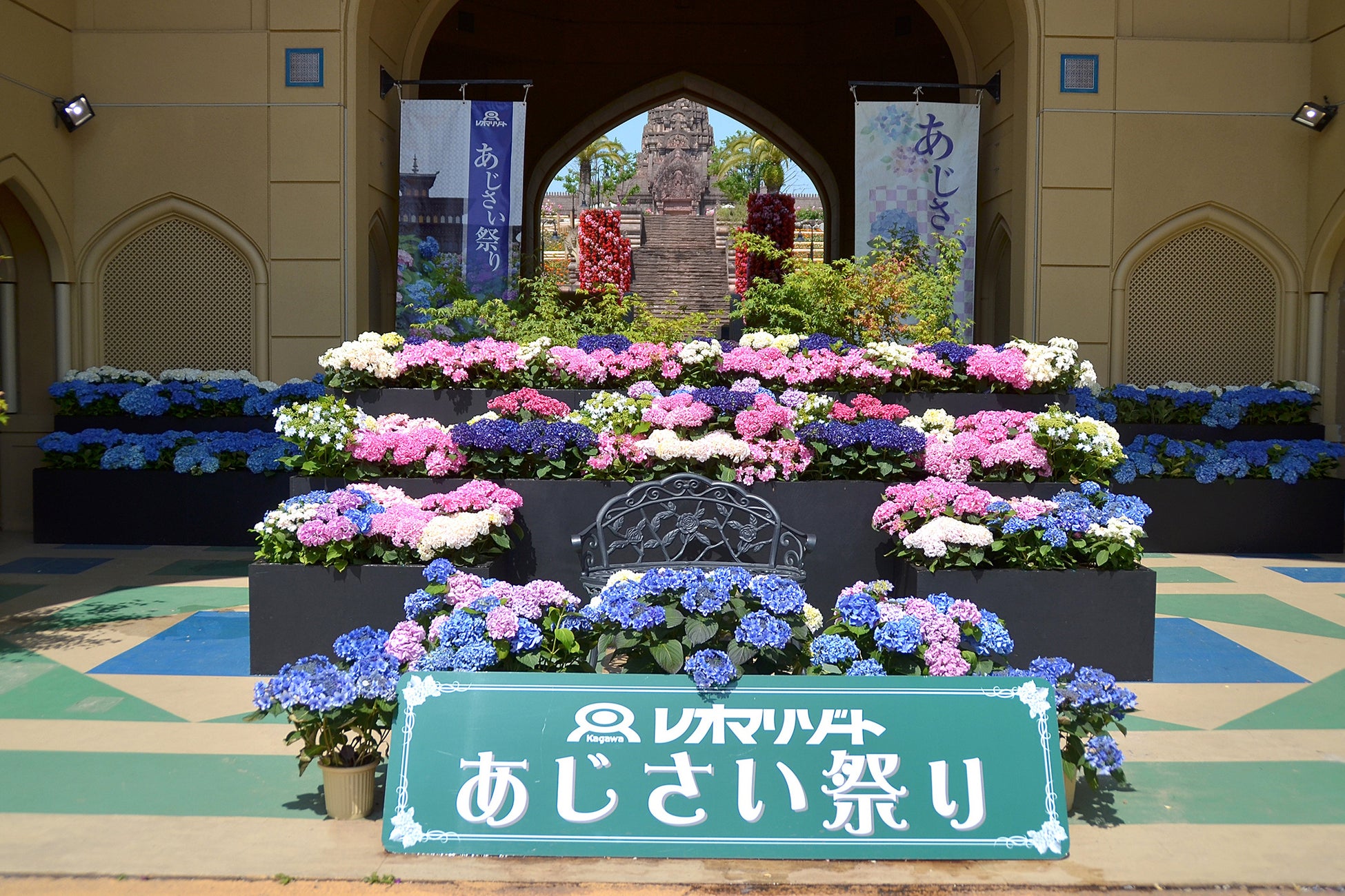 しっとりとした梅雨の時期を彩り、天気によってさまざまな表情を見せてくれるあじさい。ウェルカムエリアでは紫やピンク、青など色とりどりのあじさいがお出迎えしてくれます。時期によって見ごろのあじさいが変わるので、長い期間お楽しみいただけます。