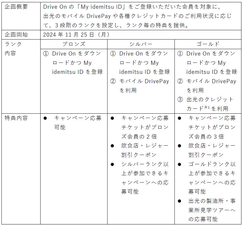 本プログラムでは、Drive Onの「My idemitsu ID」をご登録いただいた会員を対象に、お得で便利なアプリ決済サービス「モバイルDrivePay」や出光の各種クレジットカード※1のご利用状況に応じて「ブロンズ」「シルバー」「ゴールド」の3段階のランク※2を設定します。ランクが上がるにつれてキャンペーンの当選確率がアップするほか、「シルバー」ランク以上の会員には飲食店・レジャー施設割引クーポン、限定イベントへの招待などの特典を提供します。「ゴールド」ランクの会員には、当社の製油所や事業所の見学ツアーへの抽選にご参加いただけます。