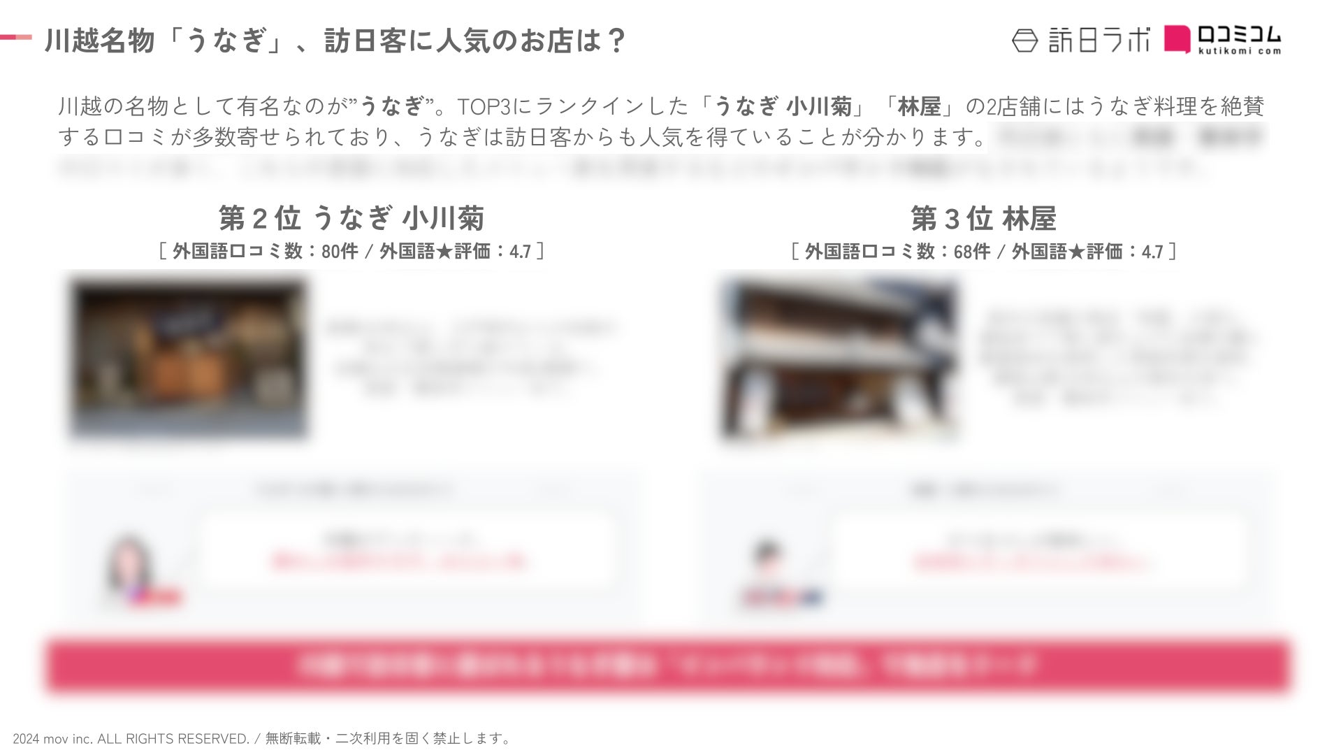 TOP3にランクインした「うなぎ 小川菊」「林屋」の2店舗にはうなぎ料理を絶賛する口コミが多数寄せられており、うなぎは訪日客からも人気を得ていることが分かります。