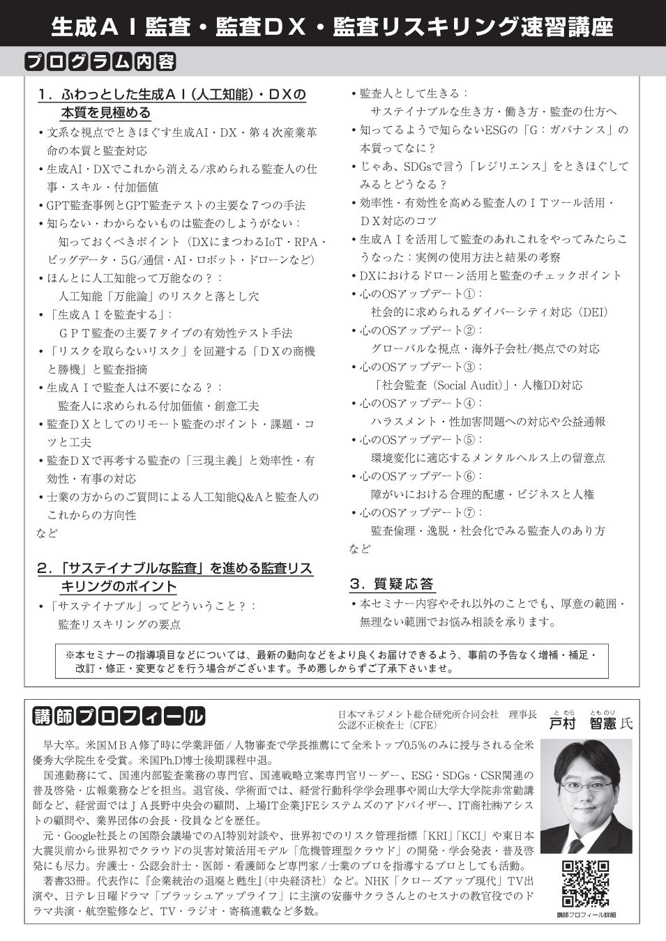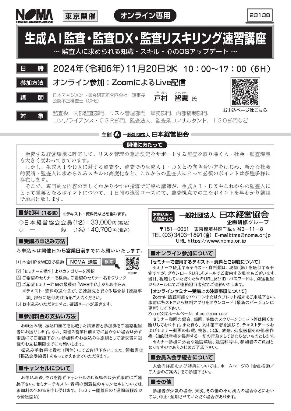 「生成AI監査・監査DX・監査リスキリング速習講座:監査人に求められる知識・スキル・心のOSアップデート」2024年11月20日(水)弊社理事長の戸村智憲が登壇【日本マネジメント総合研究所合同会社】