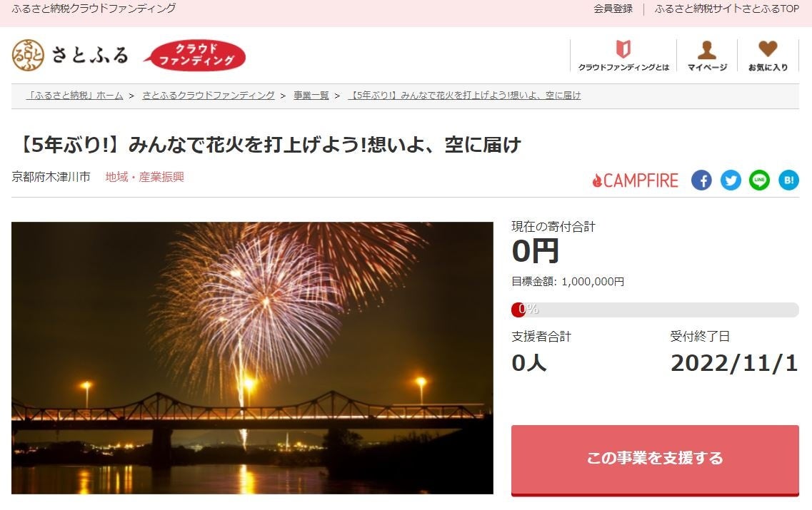 京都府木津川市とさとふる、市民まつりで花火を打ち上げ、人々に感動を届けるため寄付受け付けを開始