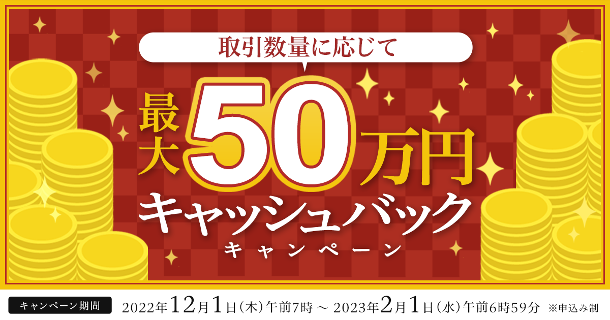 GMOインターネットグループのGMOフィナンシャルホールディングス株式会社の連結会社で、金融商品取引業および商品先物取引業を営む株式会社FXプライムbyGMO(代表取締役社長 安田和敏、以下FXプライムbyGMO)は、2022年12月1日(木)より、外国為替保証金取引(FX)『選べる外貨』での新規取引で最大50万円をキャッシュバックするキャンペーンを開始しました。