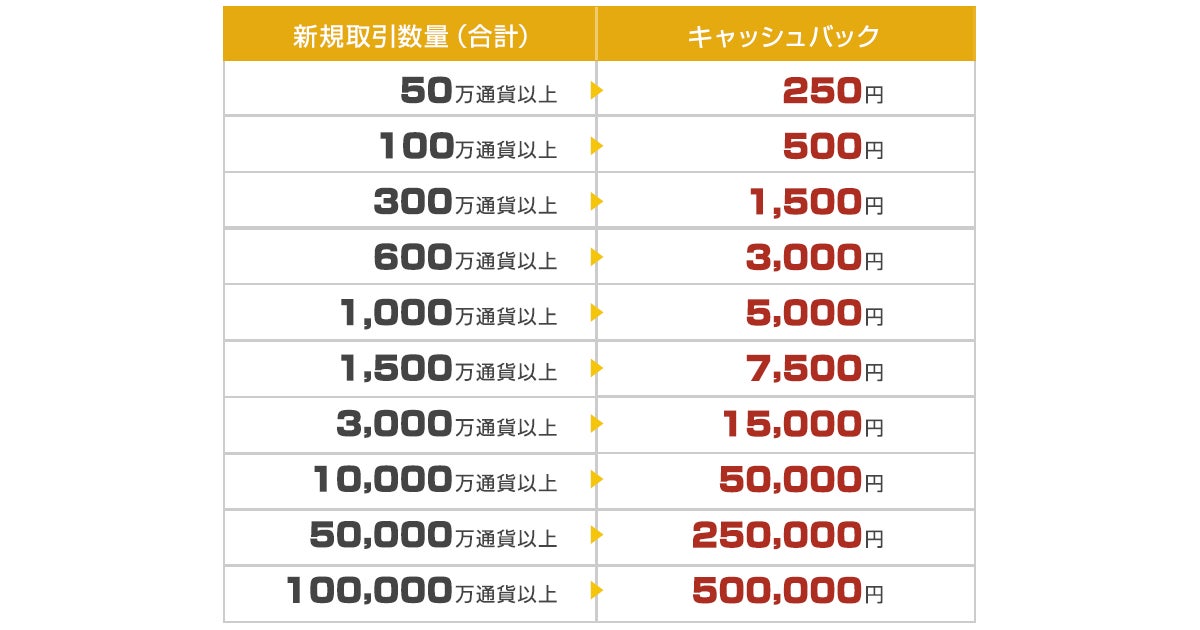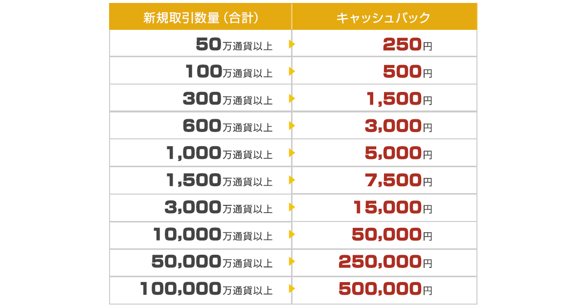 『選べる外貨』のお取引で、期間中の新規取引数量の合計が、以下の条件を達成されたお客様に、キャッシュバックいたします。