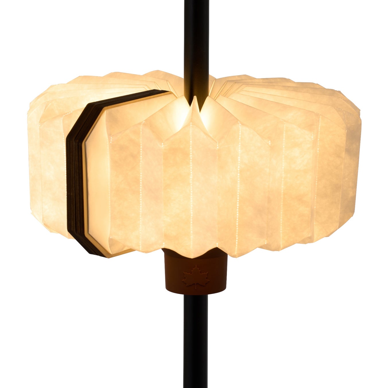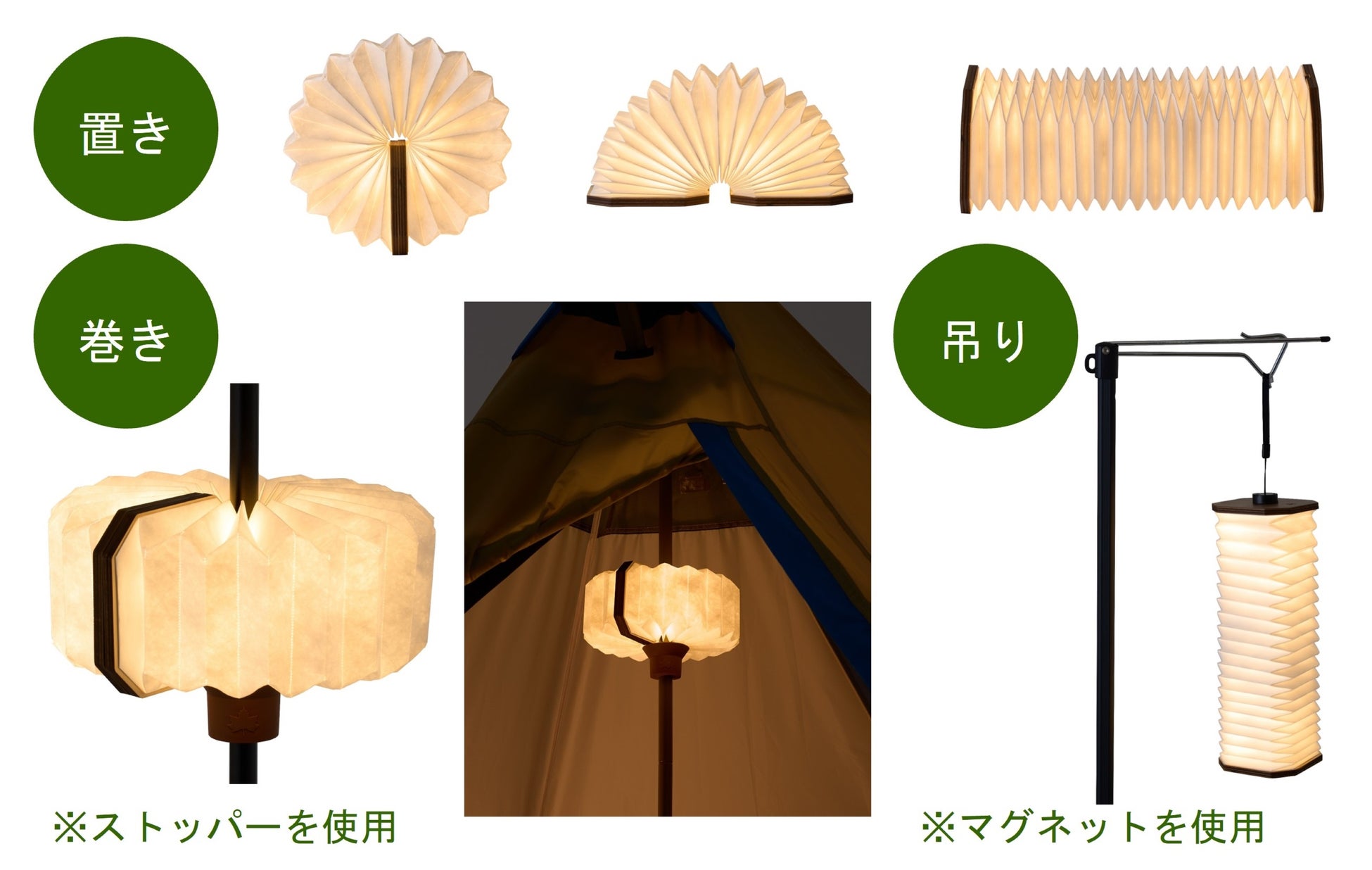 アコーディオンのような特徴的な形状は、自由自在に伸縮し、テーブルライトとしても置いて使えることはもちろん、付属のストッパーやマグネットを使えばランタンポールに巻き付けたり、吊るして使うこともできるので、様々な使い方を楽しむことができます。