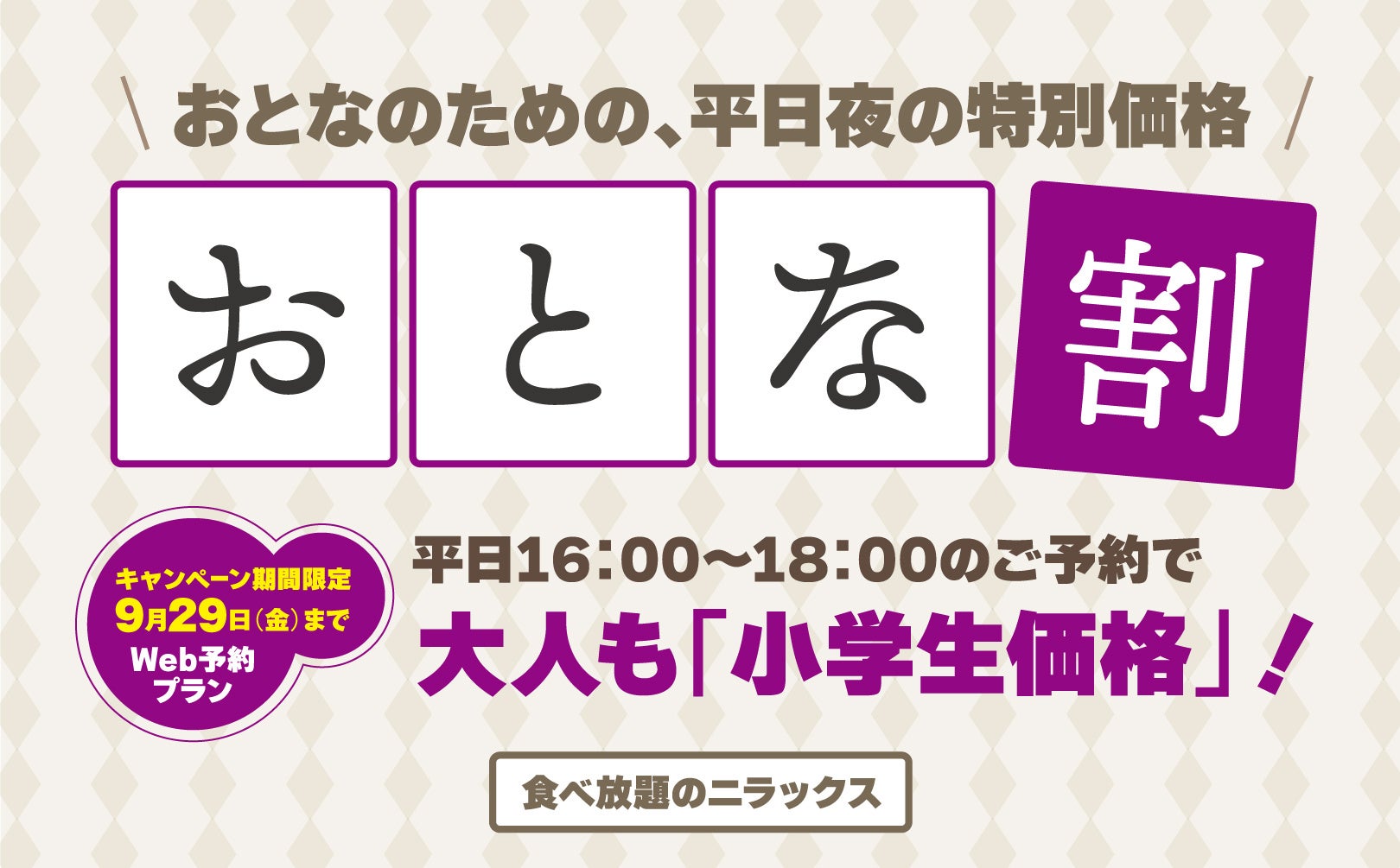 この度、2023年9月1日(金)~ 2023年9月29日(金)の平日ディナーWEB予約限定にて、大人も『プレミアムコース』が『小学生料金』でご利用できる『おとな割』のご予約を開始いたします!