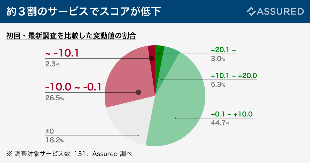 その結果、28.8%のサービスでスコアが低下しており、2.3%が10ポイント超低下していました。クラウドサービスは日々アップデートされており、機能追加や仕様変更などによりセキュリティリスクが変動する可能性があります。そのため、新規導入時だけでなく利用サービスの定期的な棚卸し、リスク評価を行うことが重要です。