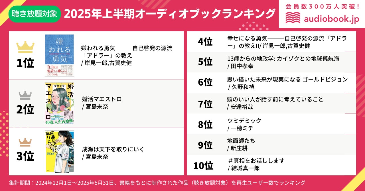 株式会社オトバンク( 本社:東京都文京区、代表取締役社長:久保田裕也、以下「オトバンク」)は、当社が運営するオーディオブック書籍ラインナップ数No.1(※1)のオーディオブック配信サービス「audiobook.jp」における、2025年 上半期(2024年12月1日~2025年5月31日)のオーディオブックランキングトップ10を発表します。