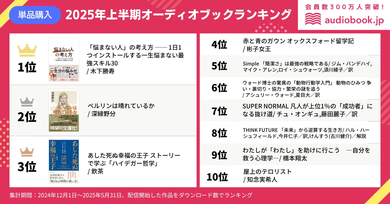 「audiobook.jp」におけるオーディオブック作品のダウンロード数または再生ユニークユーザー数をもとに順位付けした、2025年上半期(2024年12月1日〜2025年5月31日)の「単品購入」と「聴き放題」の人気ランキング トップ10を発表します。
