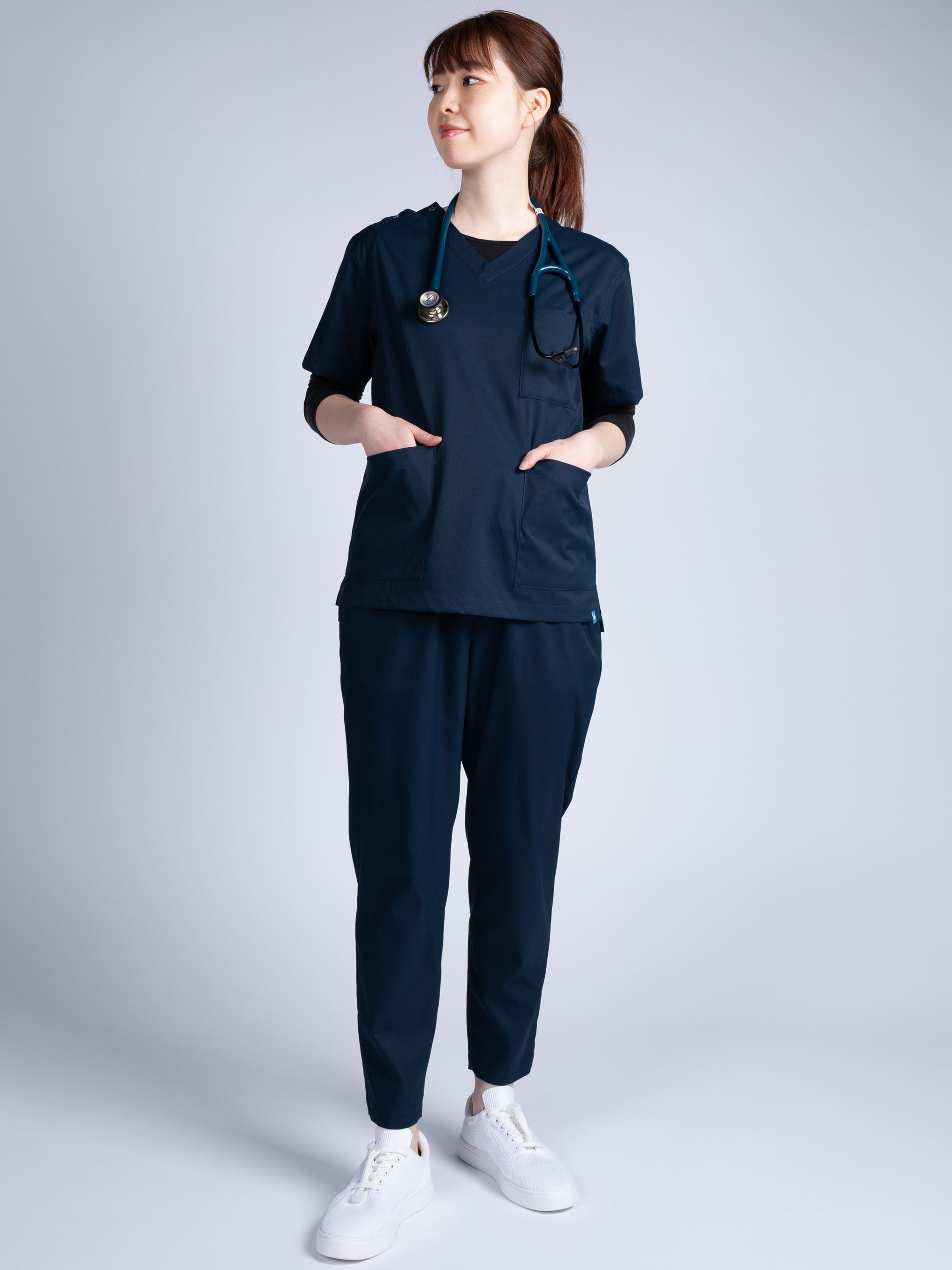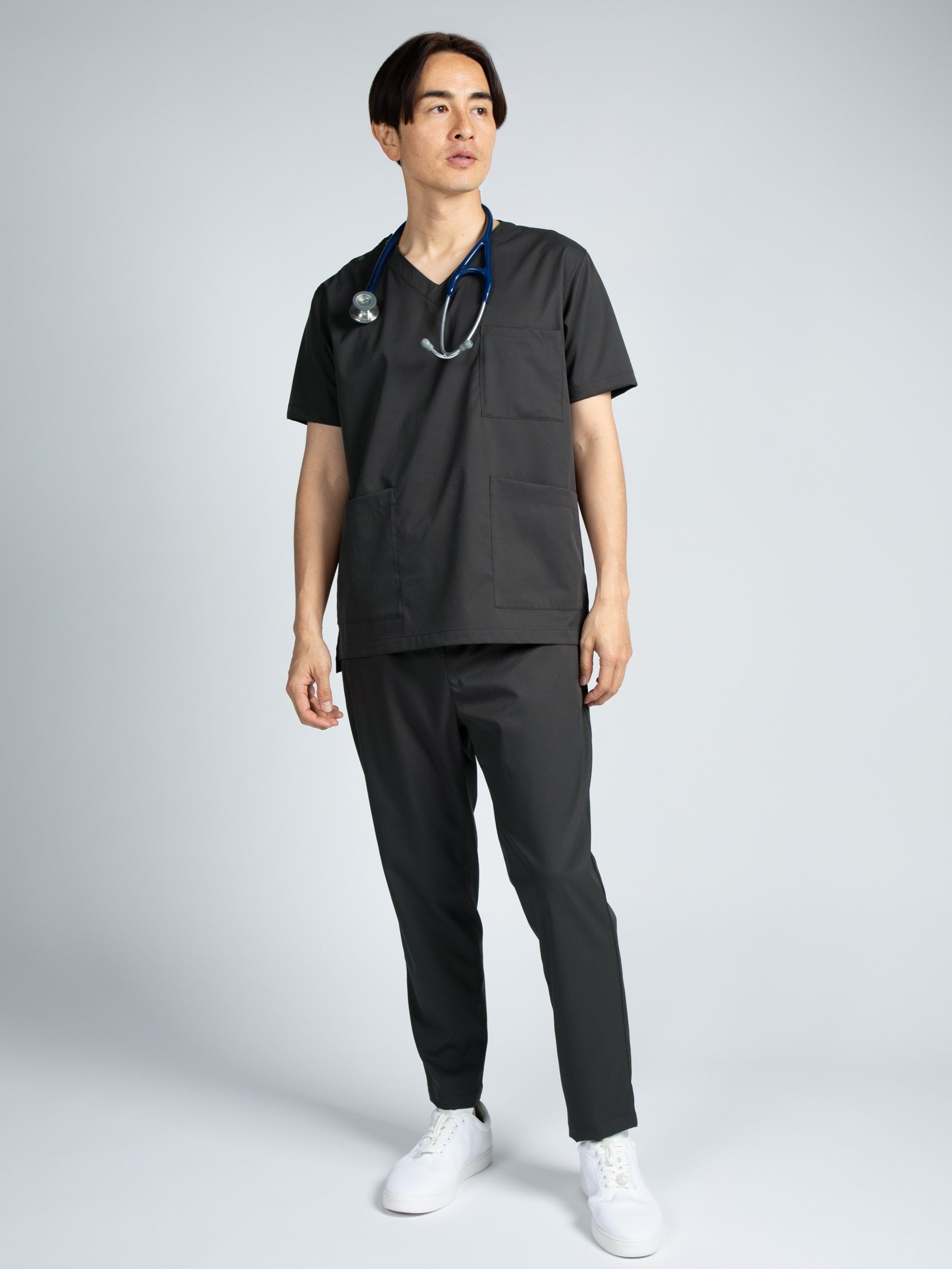 特 徴:独自開発素材「ultimex」を使用しストレッチ・速乾・撥水・洗濯可・イージーケアの機能性に合わせて、肌触りが柔らかくストレスになりにくい軽さを兼ね備えました。「スクラブシャツ」は胸ポケットとフロントポケットが計3つあり、胸ポケット内にペンを固定できるペン差しが2つ、左のフロントポケット内に医療用PHS(ピッチ)やスマートフォンが入る専用ポケットを完備。患者様と接触する際に静電気が起こりにくいように両脇下、裾、袖口、首後ろの計7か所に放電テープを配置。着脱が容易できるよう、右肩口をドットボタン仕様にしました。「スクラブパンツ」はウエストを総ゴムにし、股上を深めにすることで動きやすいデザインにしました。ポケットはサイドポケットとバックポケット以外に、ファスナー付きポケットの計5つ。腰と裾の4か所に放電テープを配置しました。