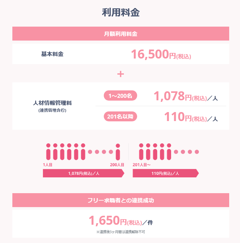 Linkusの月額利用料金は、基本料金16,500円(税込)、人材情報管理費として1人につき、1~200名までは1,078円(税込)、201名以上からは110円(税込)となっています。