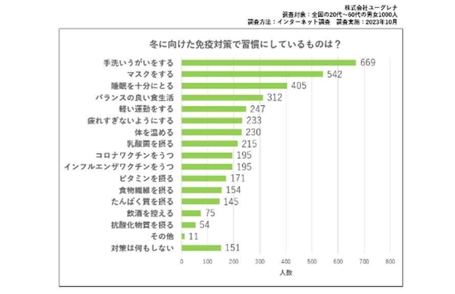 調査の結果、上位には「手洗いうがいをする」(669人)、「マスクをする」(542人)、「睡眠を十分に摂る」(405人)、「バランスの良い食生活」(312人)と続き、基本的な感染症対策・免疫対策についての知識が多くの方に浸透していることがわかりました。
