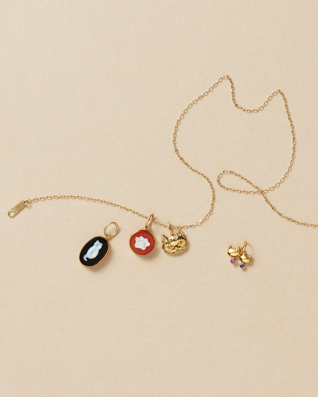 注目は、ブラックカルセドニーにふっくらとした猫シルエットのシェルを、オレンジアゲートに肉球シルエットのシェルを貼り合わせ、シックな雰囲気に仕上げたチャーム。キリリとした瞳が印象的な猫チャームは、クラフト感のあるテクスチャーが猫の艶やかな毛並みを思わせます。寄り添う姿が愛らしい親子の猫チャームは、お母さん猫に「愛情」を象徴するルビー、子猫に「誠実」や「守り」を象徴するサファイアをあしらい、親子の絆をそっと感じさせます。