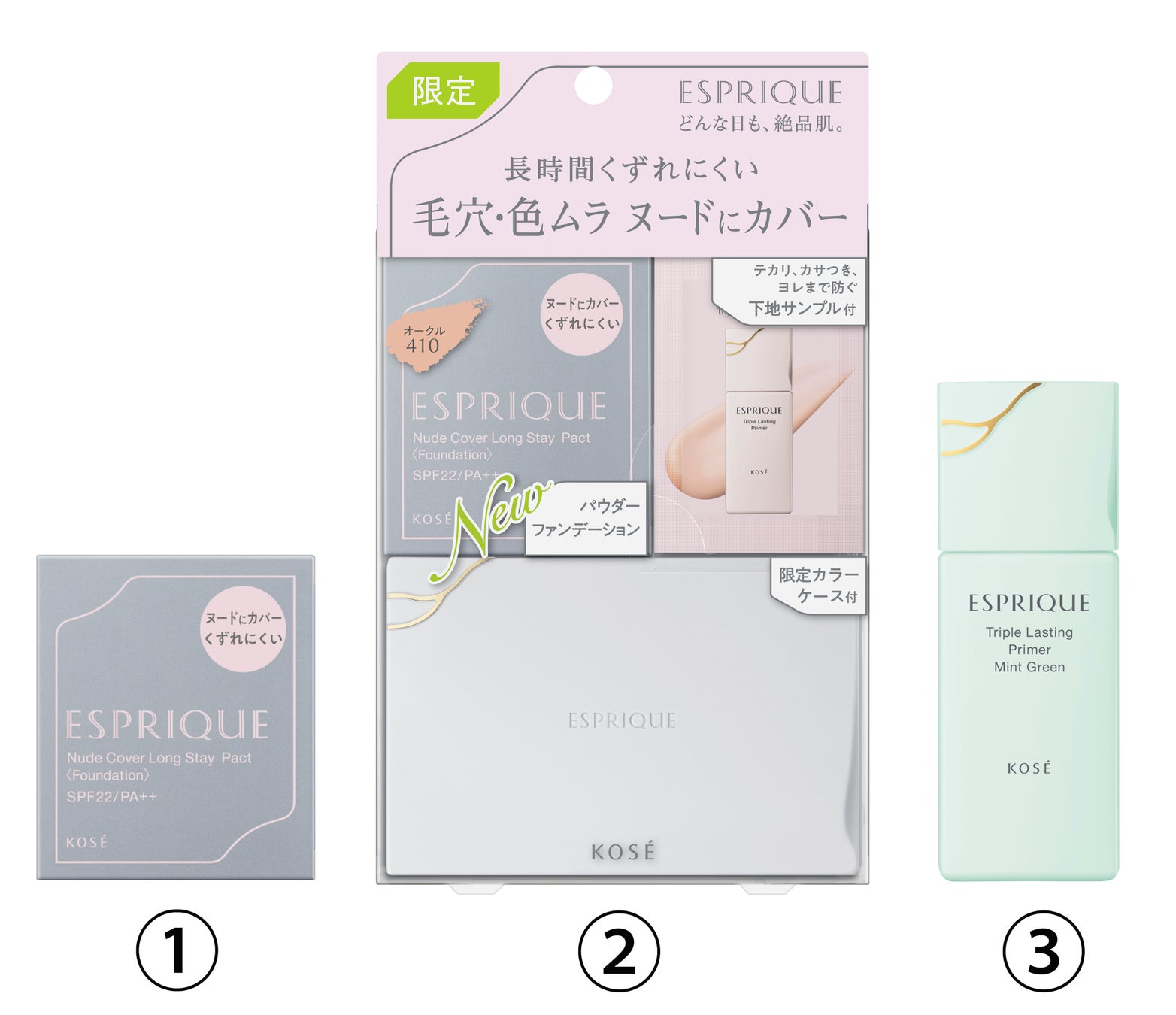 同時に、皮脂・乾燥・表情の動きによる化粧くずれをトリプルで防ぎ、美しい仕上がりを持続させる化粧下地「トリプル ラスティング プライマー(※5)」の1回分サンプルと、ファンデーション用の限定カラーケースがついた「ヌードカバー ロングステイ パクト 限定キット」と、「トリプル ラスティング プライマー」のくずれにくい機能はそのままに、肌の赤みを補整し自然な透明感を演出する、ミントグリーンカラーの「トリプル ラスティング プライマー ミントグリーン」も発売します。