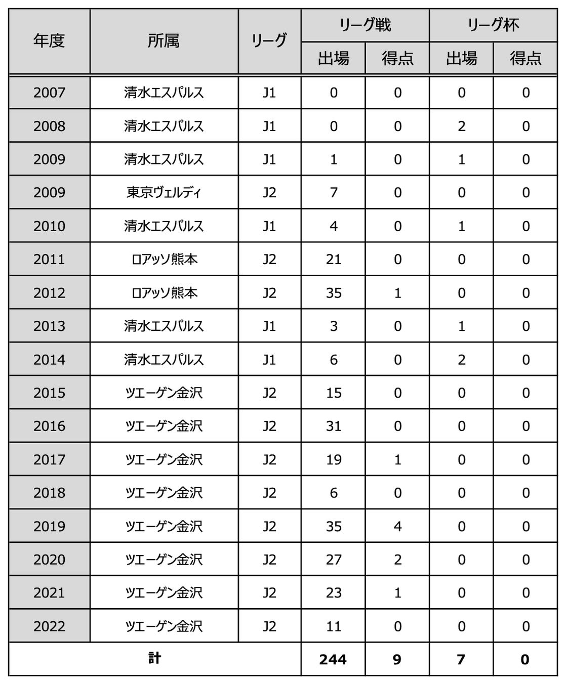 J1リーグ 14試合(0得点) / J2リーグ 230試合(9得点)