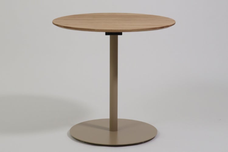 天板サイズは直径600㎜、750㎜、450㎜/角750㎜×750㎜、600㎜×800㎜、天板カラーは、国産ナラ集成材天板3色、デニム製造端材リサイクル材天板2色、メラミン化粧板天板2色からお選びいただけます。